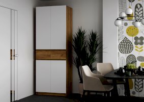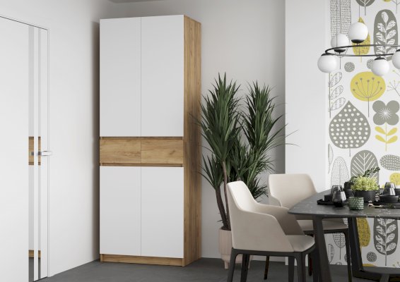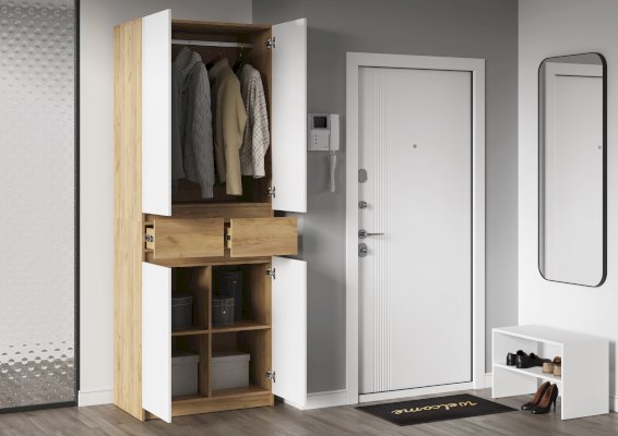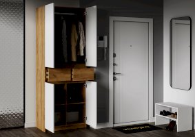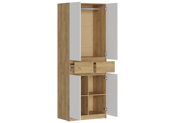 Этот двухстворчатый шкаф КВИК-СТЕП ШК-001 станет элегантным и функциональным дополнением к любому современному интерьеру. Сочетание деревянной текстуры и белых фасадов позволяет ему гармонично вписаться в различные стили, такие как скандинавский, минимализм и лофт.