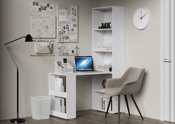 Особенность письменного стола СП-002 Эва заключается в необычной конструкции: с одной стороны стол опирается на компактное подстолье с удобными полками для хранения, а с другой – крепится к стене с помощью специальной планки.